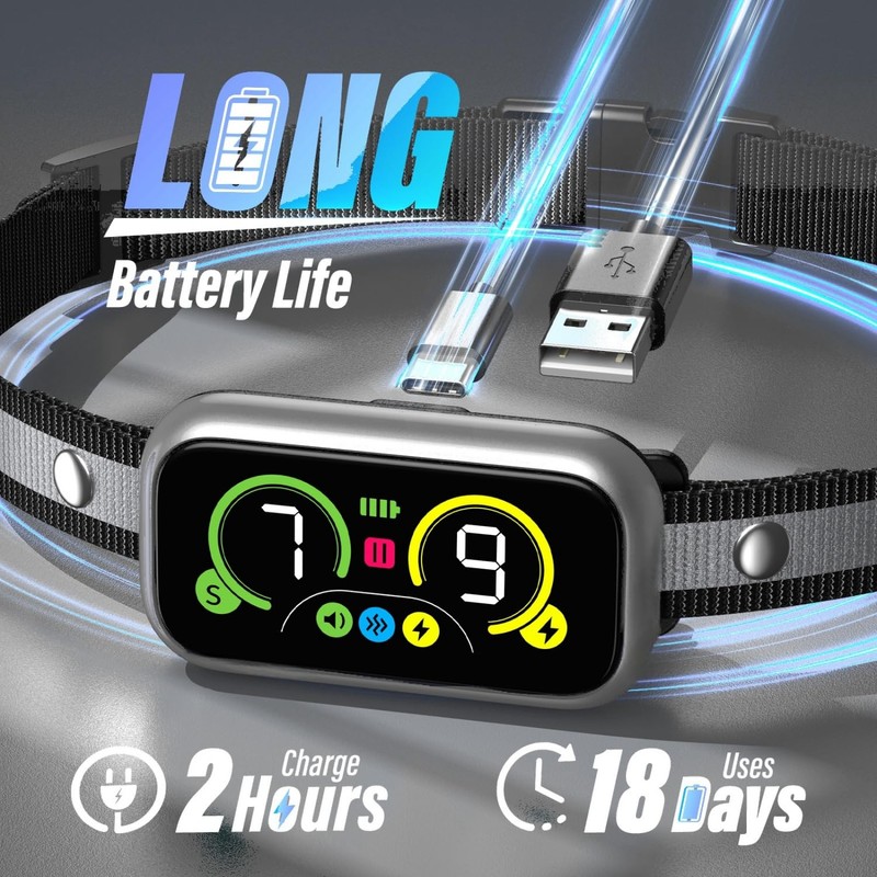 • 【QUICKER CHARGING, LONGER LASTING, ONLY CHARGE 1-2 TIMES A MONTH】 Kollgux bark collar for medium dogs adopts a new charging method, which is simple to operate and more stable to charge. A full charge in 2 hours can be used for about 18 days, so you just need to charge it 1-2 times a month. There is also a battery reminder on the display so you can know the battery status at any time. The Type-C charging way greatly improves the waterproofness, so you can train your dog anytime, anywhere