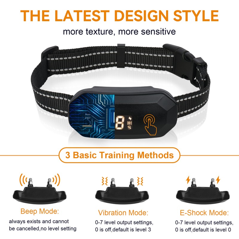 1、Charging: This device supports contact charging and DC5V charging, making it convenient to power up. 2、Weatherproof: It works well even in rainy weather, ensuring uninterrupted training sessions. 3、Adjustable Levels: The device offers adjustable levels (0-7) for vibration and shock modes, allowing you to customize the training intensity. 4、Three Training Modes: It features sound (fixed intensity), vibration (adjustable intensity), and shock (adjustable intensity) modes for comprehensive training. 5、Energy Saving: The device enters power-saving mode if there's no operation within 5 seconds, prolonging battery life.
