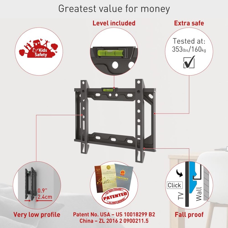 - PATENTED, AUTO LOCKING MECHANISM - This TV mount includes a US & China approved patent of Auto Locking Mechanism, to prevent the disengagement of the screen from the wall, unlike other screw locking mechanisms that are usually not performed. In the Auto lock mechanism there aren't any cords or springs that might break and it includes 2 hanging points on each side, instead of the single hanging point in most locking mechanisms.