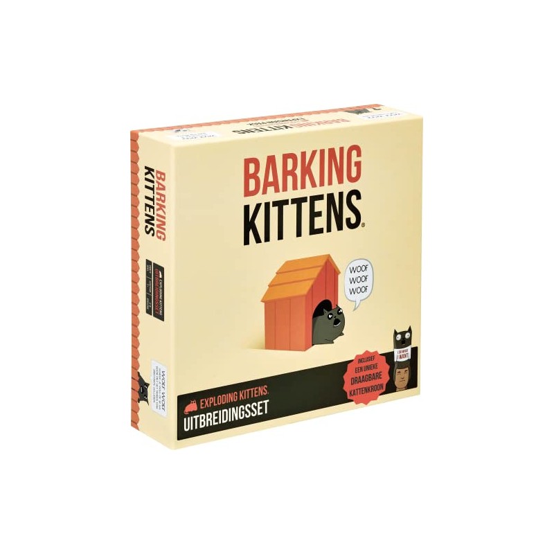 • Now also available in a Dutch edition: Expansion Set #3 for Exploding Kittens: Barking Kittens! This set contains 20 new cards and a unique, portable cat crown!