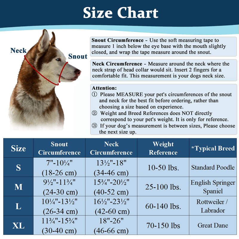 - MEASURE BEFORE BUYING: Size L fits snout circumference 7.9"-14", neck circumference 17.7"-24.4". Recommended Breeds such as Bull Terrier, German Shepherd, Golden Retriever, Husky, Labrador, Malamute, Weimaraner, Great Dane. The right size is important for your dog's comfort with the head collar on.