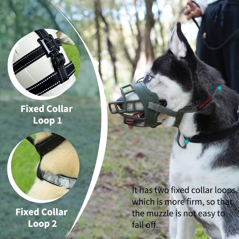 - Upgraded and Stable: The webbing of the dog muzzle has been upgraded to make it more sturdy and not easy to break, and increase the service life. The buckle is upgraded with a safety lock, providing double protection and coming with two additional safety loops which can be connected to your dog on the regular collar. This is a more sturdy scratch-resistant design