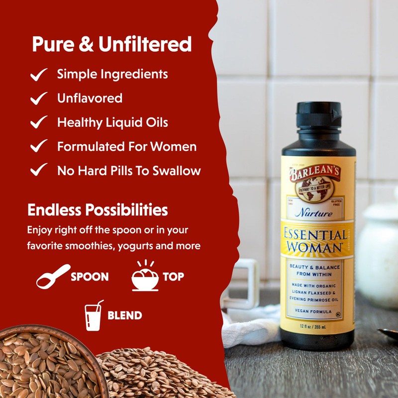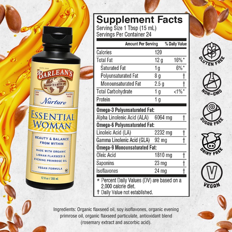 Barlean's Essential Woman Liquid Supplement for Women, Organic Flaxseed and Evening Primrose Oil for Healthy Hair, Nails and Skin, Omega 3 6 9 and GLA, 12 oz