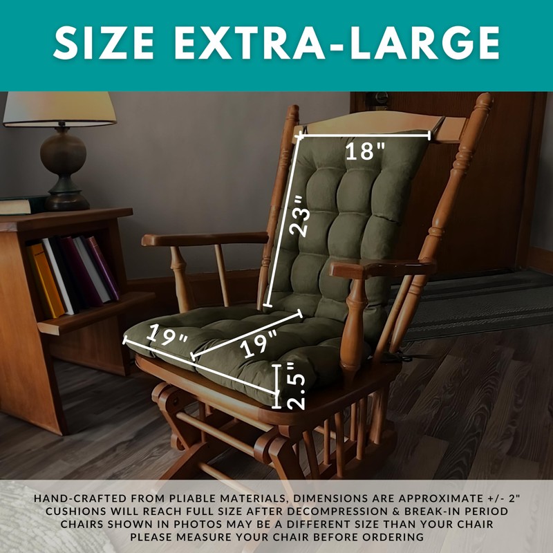 - Size Extra Large Rocking Chair Cushion Set - Seat 19.5”D x 19”W x 2.5"H; Back 18”W x 23”L (Dimensions approximate +/- 2" requires break-in period). Rocking chair pad set of one seat cushion and one back cushion, for one chair, chair not included, headrest pillow sold separately