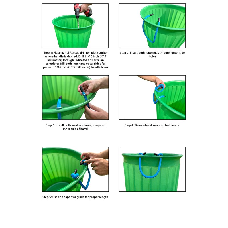 • EASY TO INSTALL: Using our Barrel Rescue drill sticker template, first position the template in the desired location. Drill two holes, each 11/16-inch (17.5 millimeters) in diameter, using either an 11/16-inch drill bit or a step drill bit to 11/16-inch. After drilling, insert the handle ends through the holes. Place washers at each end for added support and durability. Finally, tie overhand knots on each side to complete the installation.