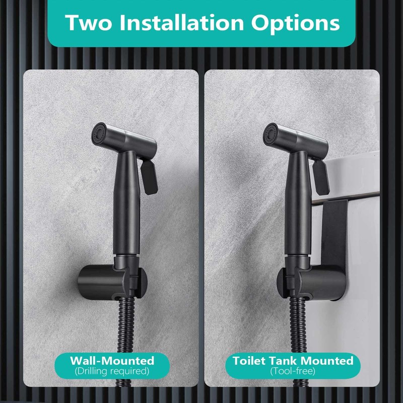 - Two Installation Options: For tank mounting, simply hook the bidet sprayer holder onto your toilet tank for a quick, tool-free DIY setup in under 5 minutes—great for beginners. For wall mounting, use the included screws for a secure installation