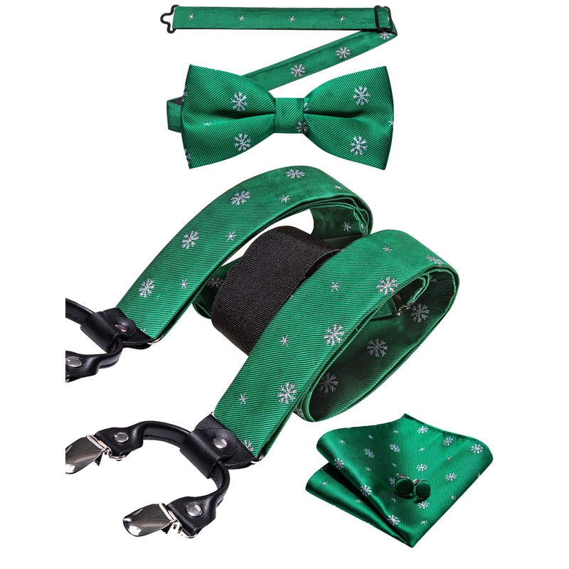 Barry.Wang Men Paisley Suspender and Bow Tie Set with Floral Pocket Square Y Shape 6 Clips Braces, Green Xmas Snowflake, One Size