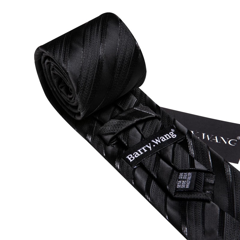 Barry.Wang Men Tie Set Stripe Black Silk Necktie Pocket Square Cufflinks Formal Business Wedding Party Prom