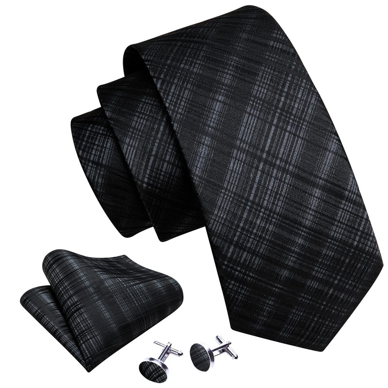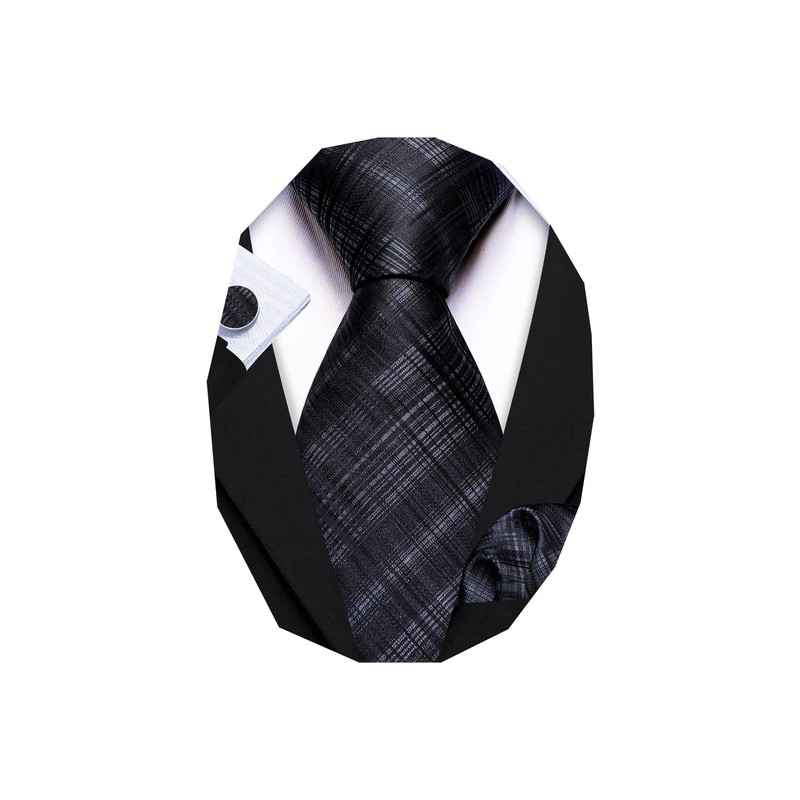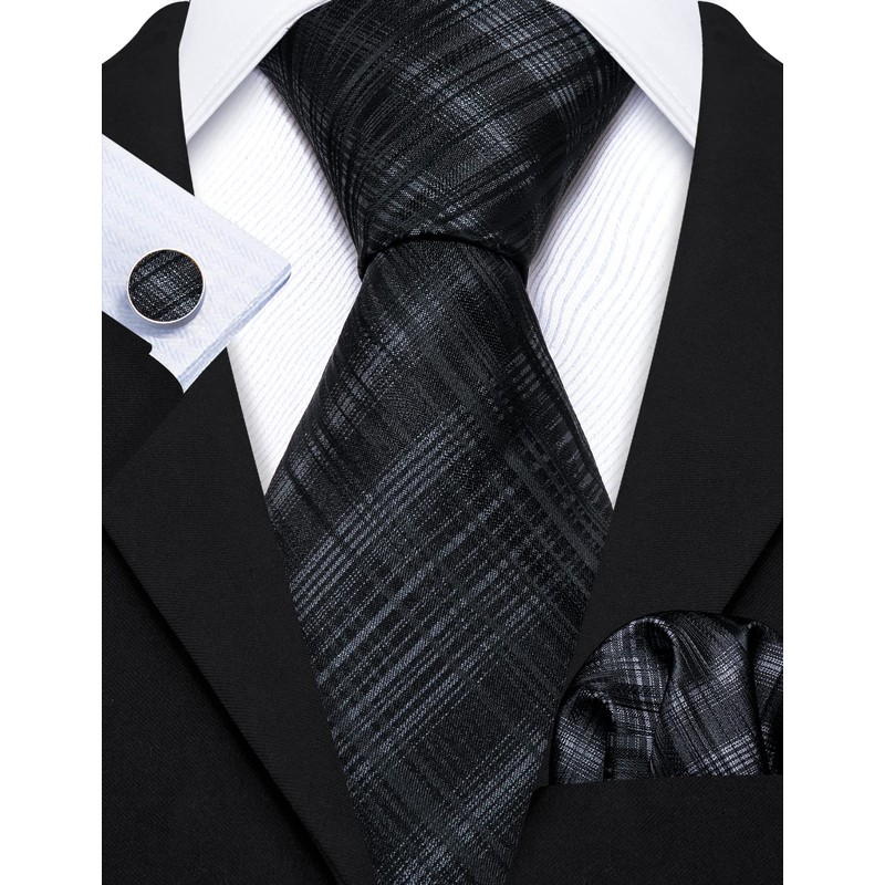 Barry.Wang Plaid Ties Check Mens Necktie Set with Handkerchief Cufflinks Classic Stripe Black and Grey