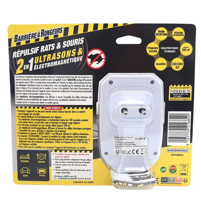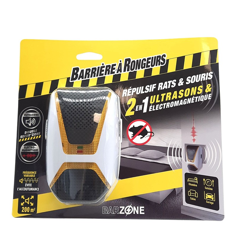 - Dual Secur'Zone-Technologie emittiert Ultraschall konstant und elektromagnetische Impulse durch alle elektrischen Leitungen, um die Nester der Nagetiere zu erreichen.