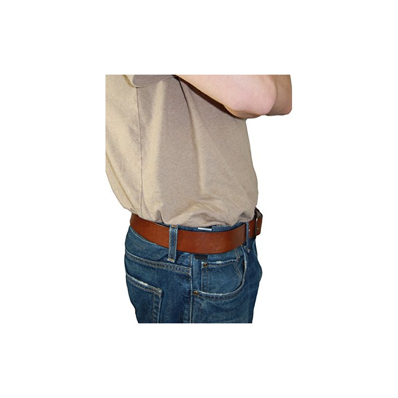 Precision stitching; lightweight; made from premium cowhide leather. Perfect for concealment without jacket. Tuck your shirt in between the belt clip and holster for ultimate concealment. Accepts belts up to 1 3/4" width. The picture shows a right hand draw- strongside (right side) holster.
