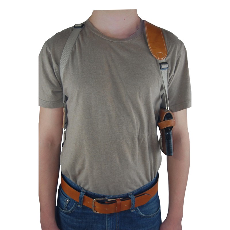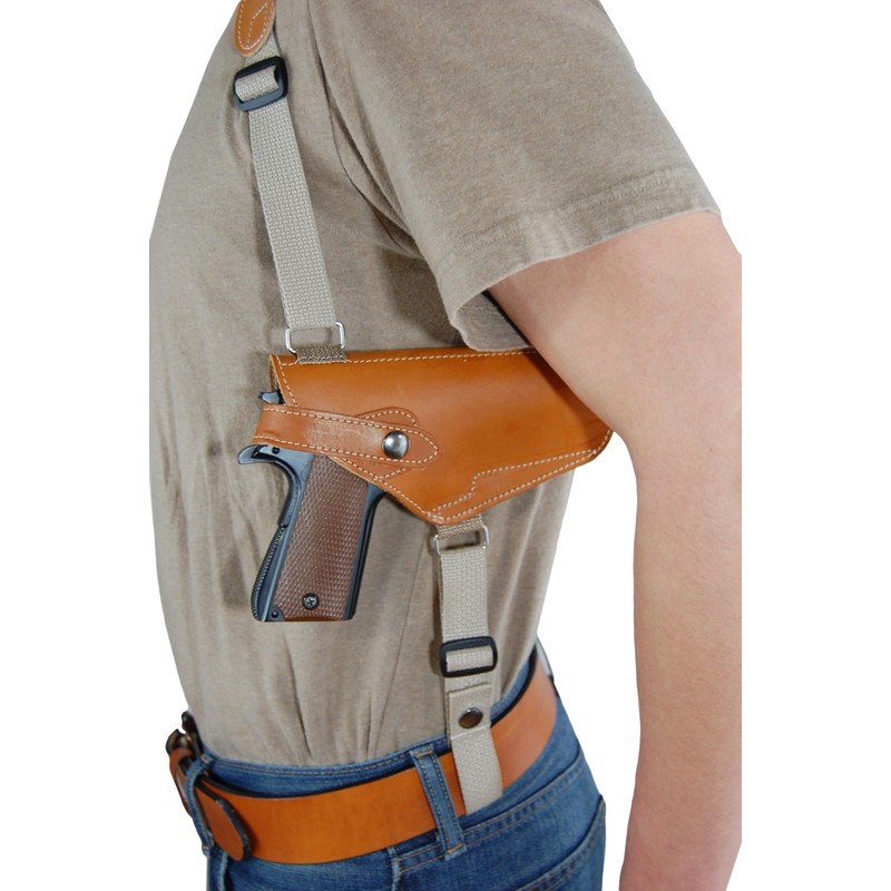 • Barsony New Horizontal Saddle Tan Leather Shoulder Holster is compatible with gun make/model sizes listed in the drop down menu. Precision stitching, lightweight (only 8 oz) and it is made in the USA. The photos show a right-hand draw shoulder holster. Adjustable up to chest size 60".