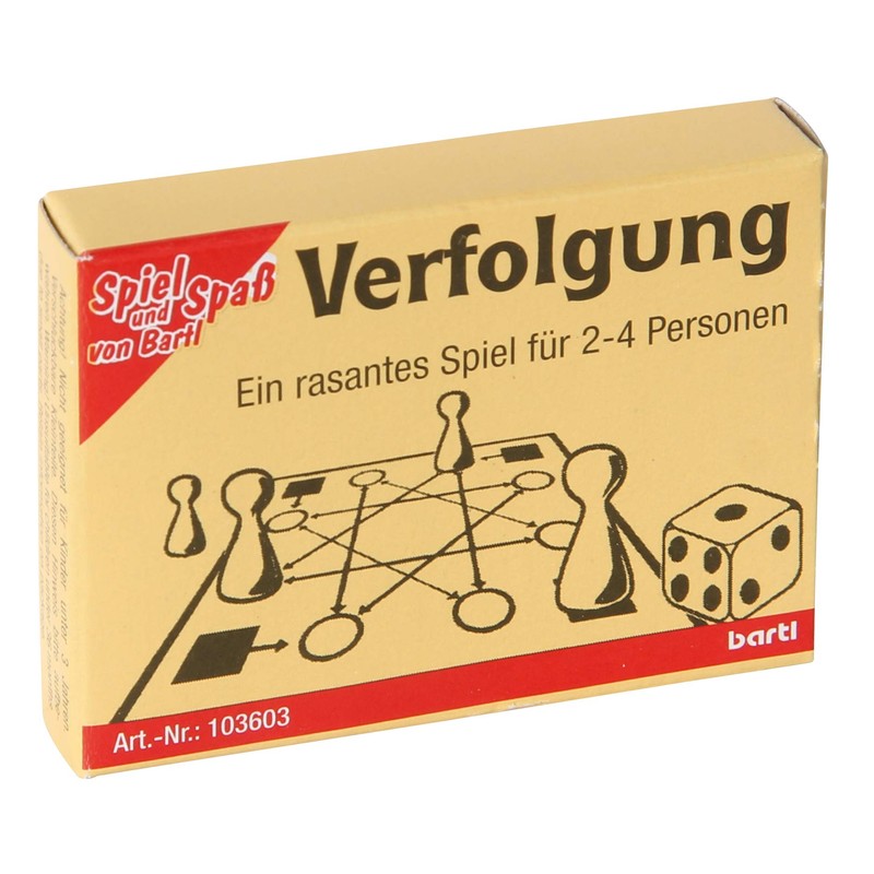 Pursuit is a mini game consisting of a wooden game board, 4 colourful toy figures and a solid wood dice.