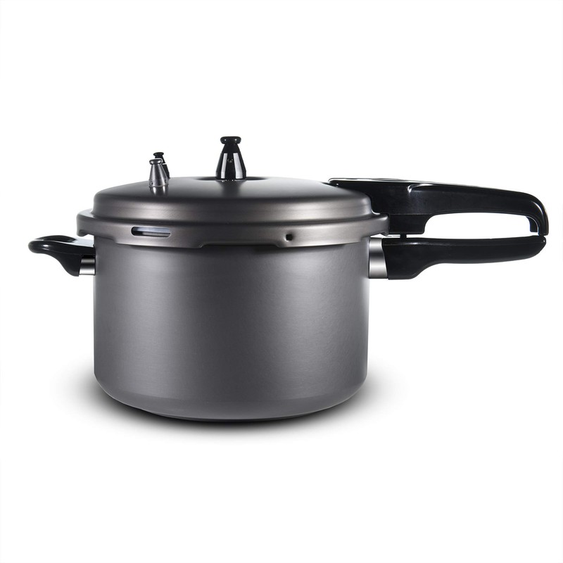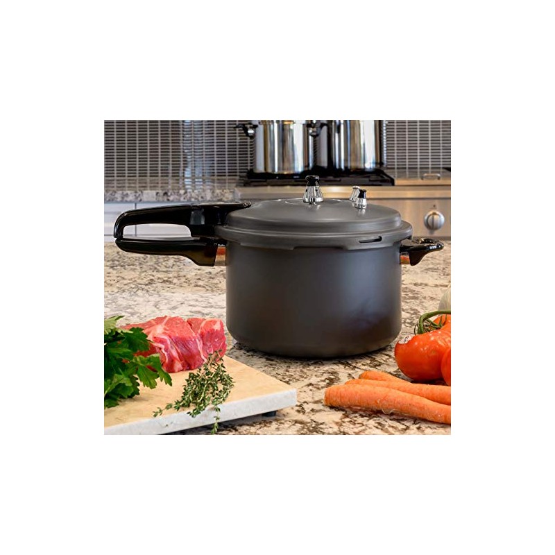 • Constructed of non-reactive, hard-anodized aluminum, this pressure cooker is both lighter in weight and more efficient than most traditional pressure cookers