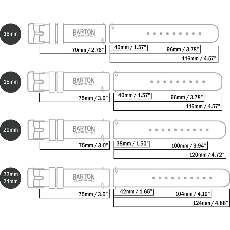 Quick release spring bars make it easy to swap straps in a matter of seconds without the need for tools. Buy multiple and swap regularly to compliment your wardrobe or mix and match with BARTON’s silicone quick release bands to take your timepiece from the workplace to the gym.