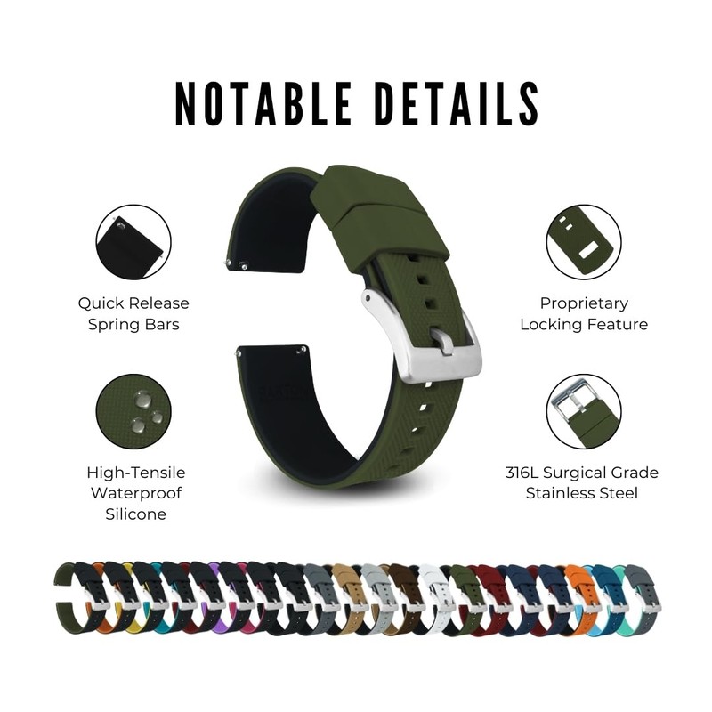- LOCKING FEATURE and OTHER ATTRIBUTES: BARTON’s proprietary locking feature assures that the free end of the strap stays securely in place. Quick release spring bars, durable silicone, solid tang 316L stainless steel buckle, scent free and dust free, 2mm taper from watch head to buckle.