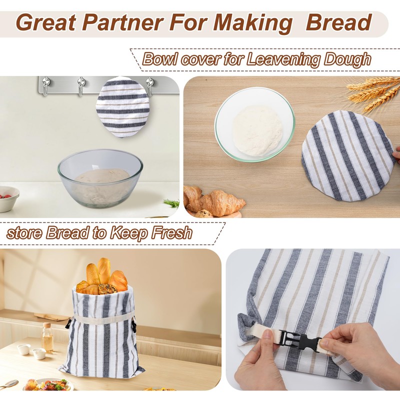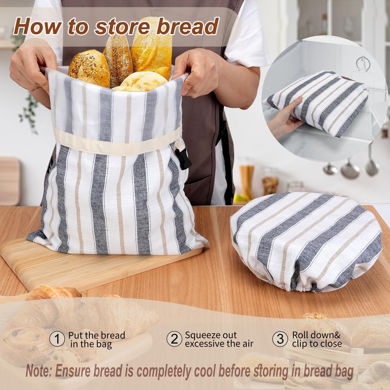 - 【Usage】The product contain 3 bread bag and 1 bowl cover. the Sourdough bread bag can hold various sizes of bread and baked goods. The bread bag contains a BPA-free plastic Lined for food storage and preservation. Detailed usage steps:1) After the bread has cooled, place it into the bread bag.2) Roll down the bag and fasten it with the button to reduce the contact between the bread and external air( Note: the bread bag buckle is only for connection purposes and does not have a tightening function.).3) For storage, it is recommended to keep in the refrigerator or freezer for better results. The Bowl cover is made of linen and cotton, which can protect the dough during the fermentation process.