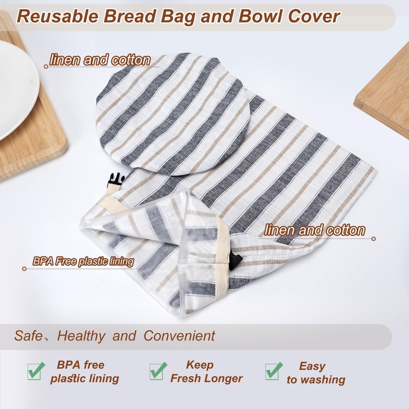- 【Quality】The bread bag is made from natural linen and cotton, breathable and durable. It features a light blue stripe design on the exterior, which is fashion.natural, and odorless. The BPA-free plastic lined ensures safe food storage while effectively maintaining freshness, preventing moisture loss and bacterial growth, and increasing food storage time. For longer storage periods, refrigeration or freezing is more effective.