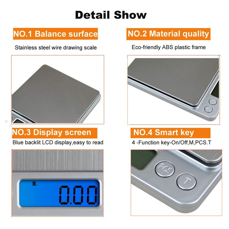 - Funciones de botón inteligente: "PCS" te permite contar piezas como alfileres, cuentas, tornillos; "T" proporciona un peso neto; "M" te ayuda a cambiar rápidamente los modos de medición entre oz/gn/ct/ozt/dwt, satisfacer tu demanda de medir diferentes cosas; y la función de apagado automático de 180 segundos para asegurar el ahorro de energía; además, puede alertar a los usuarios de baja potencia de batería y sobrecarga