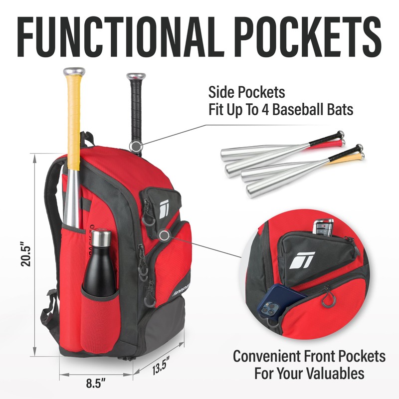 - PLENTY OF FUNCTIONAL POCKETS - Features four side pockets for baseball bats and water bottles, accommodating up to 4 baseball bats. Two front pockets keep your keys, wallet, and phone protected and easily accessible.