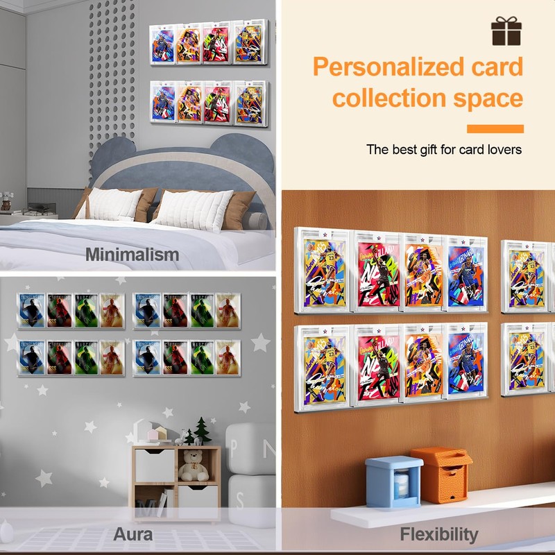 • ✅ Effortless Installation & Secure Hold - Slide cards in, attach adhesive pads, and press firmly to any smooth wall—no tools needed. 3M stickers provide reliable adhesion, preventing slips. Anti-theft locks not included (unlike premium cabinets), but ideal for secure home displays.