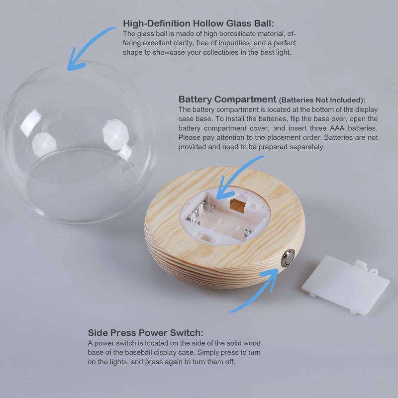 - Elegant LED Illumination:Equipped with LED lights, this lighted baseball display case highlights your collection, creating an eye-catching presentation. Simply insert 3 AAA batteries (not included) into the base, and your custom baseball shines brilliantly.