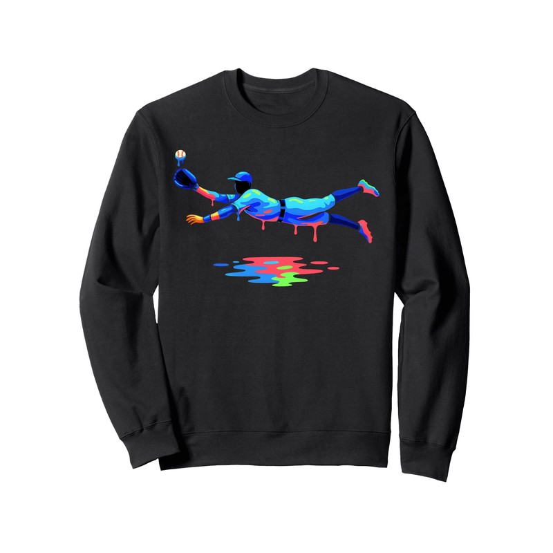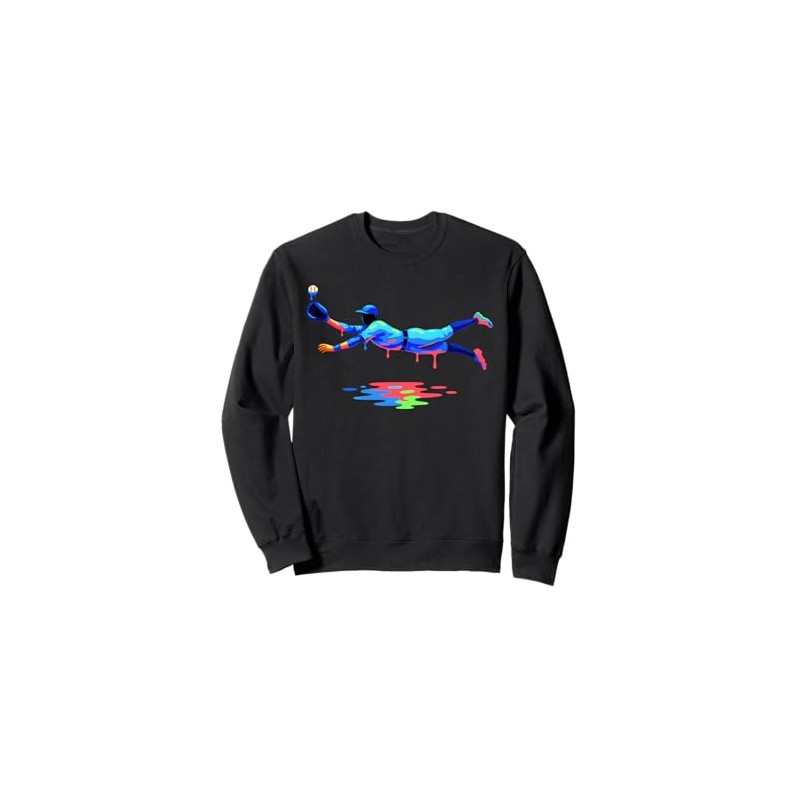 - A vibrant baseball design showing a player flying mid-air for a catch, dripping ice cream colors. Perfect for youth boys girls men and women who love unique baseball gear. Fun bold and sporty style for summer and game day!