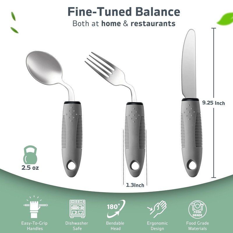 - CUBIERTOS ADAPTABLES VERSÁTILES: Adecuados para diversas condiciones, como Parkinson, artritis, temblores en las manos y destreza limitada. Mejora la independencia y la dignidad durante las comidas.