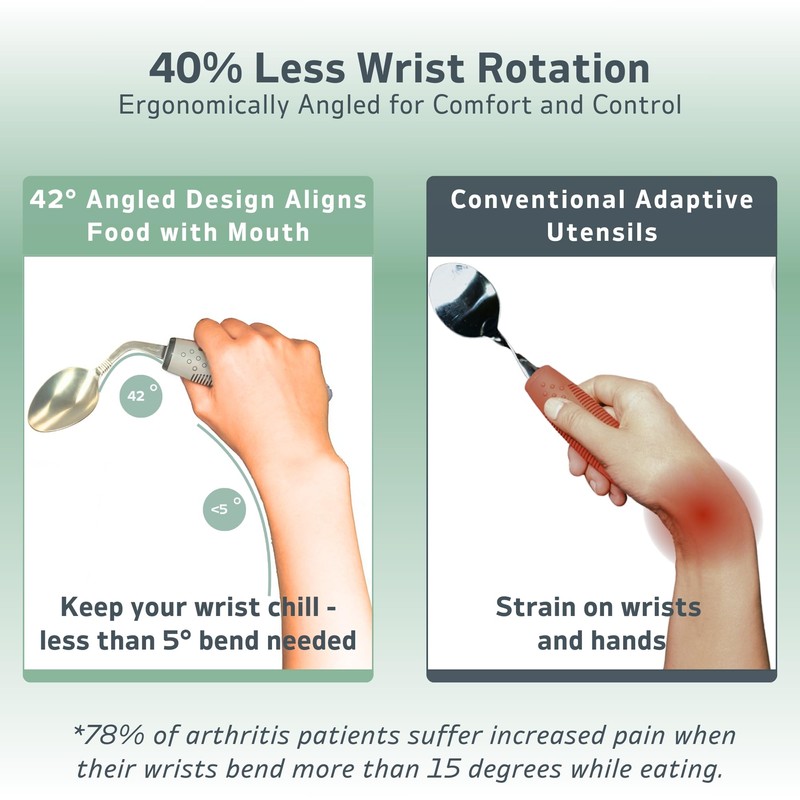 - DISEÑO ERGONÓMICO DE 42°: Especialmente diseñado para pacientes con Parkinson, personas mayores y aquellos con temblores en las manos o artritis. Reduce la rotación de la muñeca y la fatiga, promoviendo la alimentación independiente.