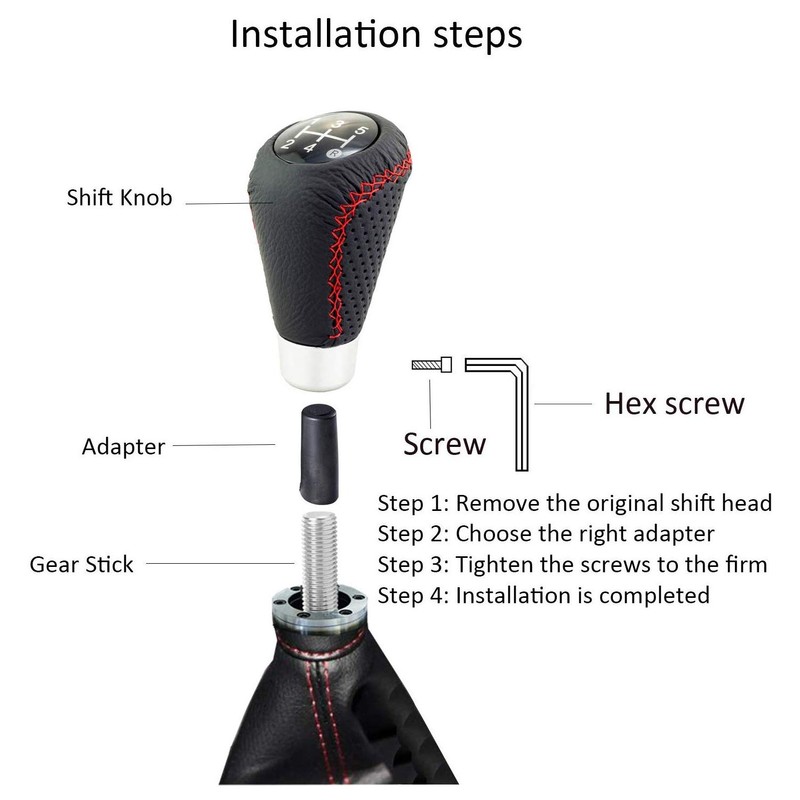The 5 speed stick shifter knob is made of high-quality leather and alloy, and we have 3 adapters to help you install quickly, only takes a few minutes, don’t need any other tools.