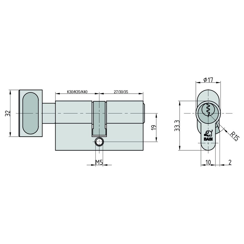 - Set of 2 knob cylinders / knob short cylinder in length K35/27 mm (K = knob side inside), simultaneous locking cylinders from the BASI V50 series, only 1 key for several locks