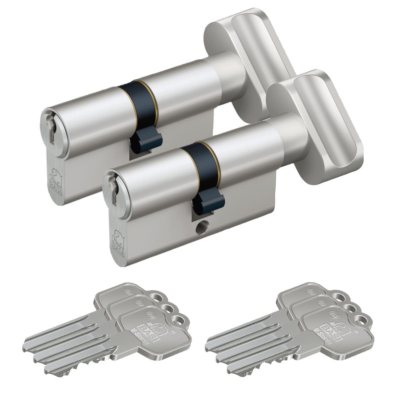 - Box contents: 2 x knob cylinders simultaneous locking K35/27 mm (total length 62 mm) | 6 keys | including face screws | BASI - everything is safe
