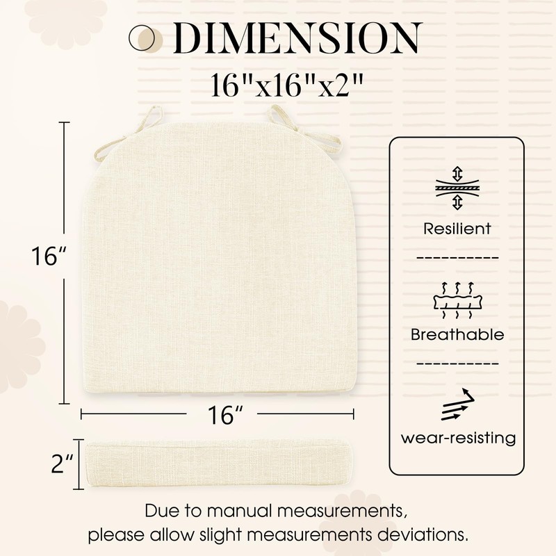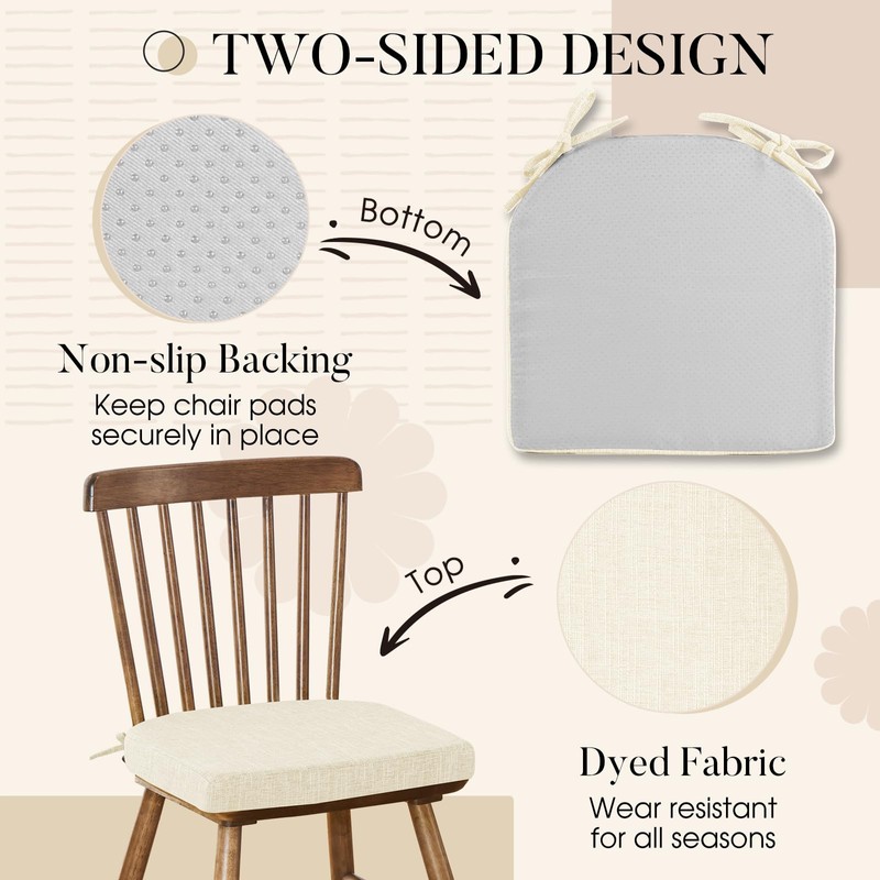 • SLIP-RESISTANT DESIGN: Our seat cushions for kitchen chairs feature a slip resistant backing to keep chair pads not slipping when sat on. Besides, there are two ties at each chair pad to keep it securely in place on any chair when guests get in or out of chair. Our double safety anti-slipping design make our chair pad a great difference from others. If the seat cushion leaves the seat when you get up, there are still two ties strap it tightly to the chair.