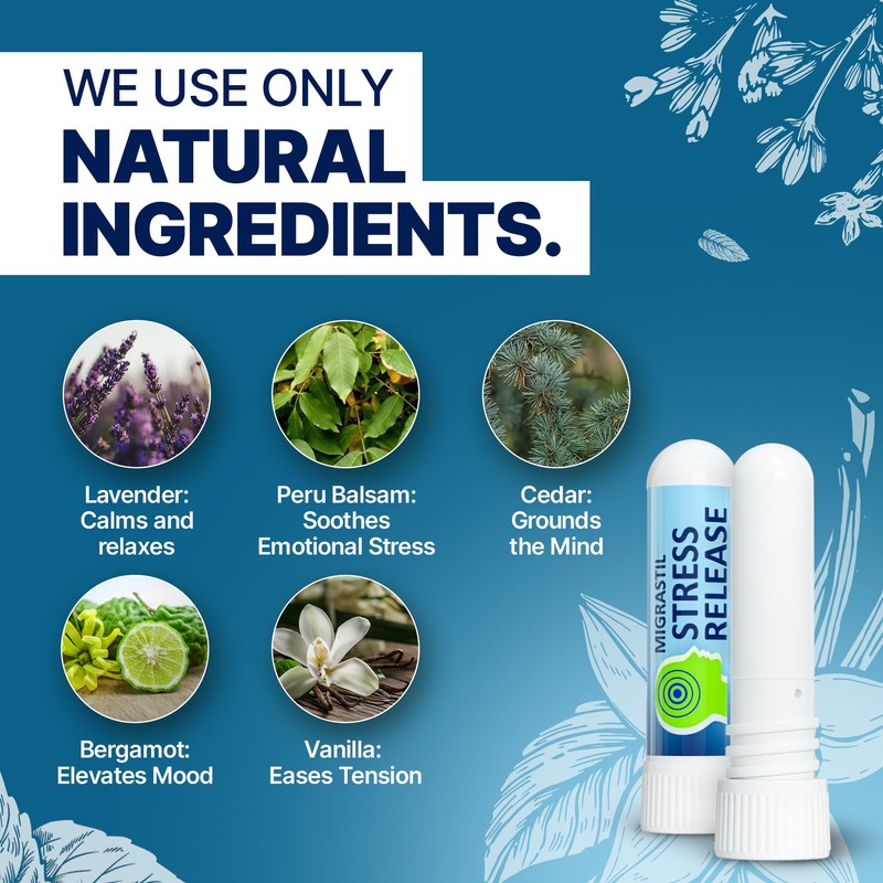 - Experience instant relaxation with the Migrastil Stress Release Aromatherapy Inhaler, crafted with a soothing blend of lavender, peru balsam, cedar, and bergamot essential oils, coupled with the warmth of vanilla CO2 extract.