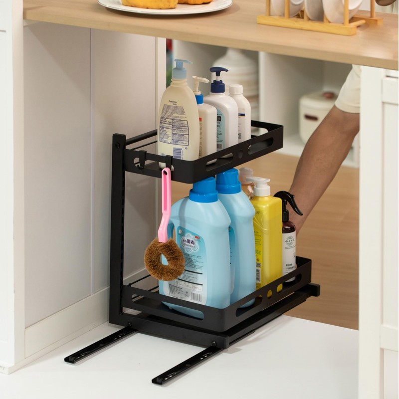 • Optimize Narrow Cabinet Storage: Make the most of tight or awkward spaces with these under-sink sliding organizers that fit seamlessly in bathroom vanities, kitchen cabinets, and utility cupboards. A smart storage solution for extra sponges, dish soap, hair products, or household cleaners—ideal for compact areas that need better organization.