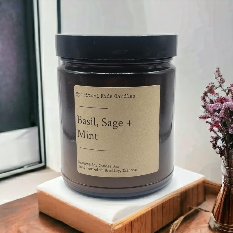 Basil, Sage & Mint 8oz Glass Jar Candle Hand Poured with All Natural Soy Wax and Fragrant/Essential Oils!