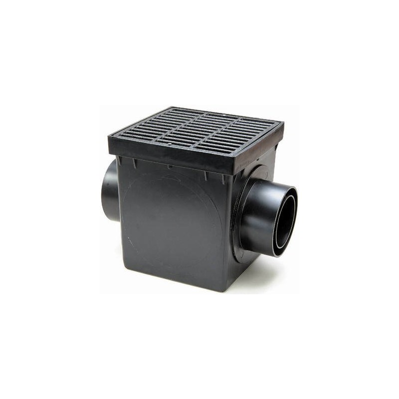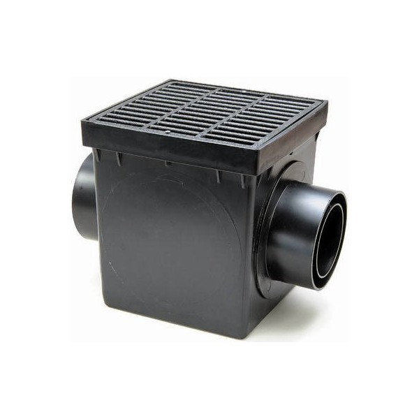 9" x 9", Double Outlet Catch Basin Kit, One 9" x 9" Double Outlet Catch Basin, 1 Plug and Two 3" and 4" Universal Outlets.