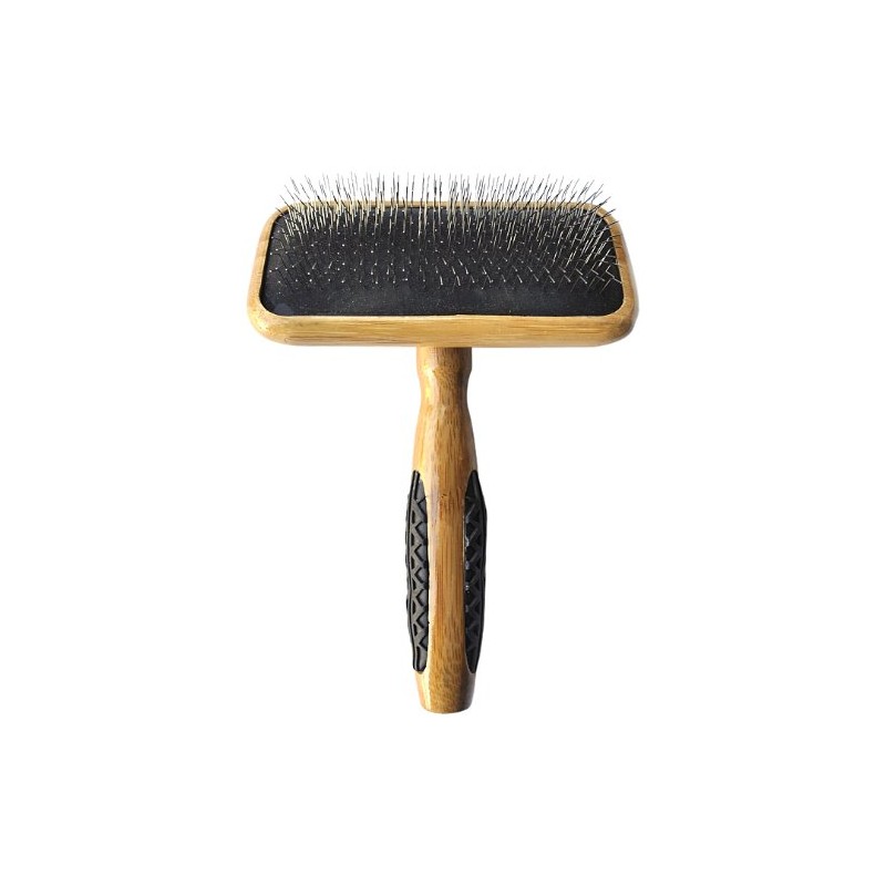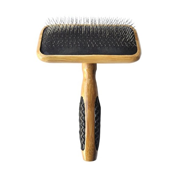 Soft Rectangular Size With Wire Pins and One Hundred Percent Bamboo Wood Handle and Rubber Grip Beautifies and Conditions the Coat of your Pet.