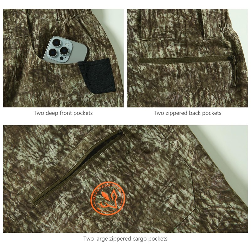 • Made of woven, silent, four-way stretch fabric with water resistant and anti-odor treatment that offers durability, freedom of movement and fresh comfort; You can stay outside for as long as you need to without worrying about odor; Bassdash unique concealing camo colors
