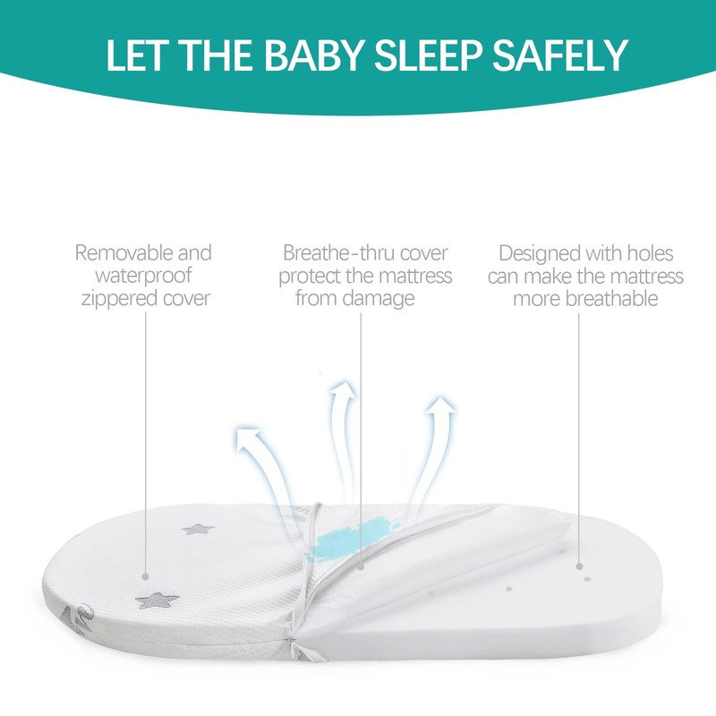 Bassinet Mattress Pad 15"x 30" Fits Dream On Me Lacy and Moses Basket, Oval Shaped with Removal Zippered Cover, Waterproof Breathable Soft Foam