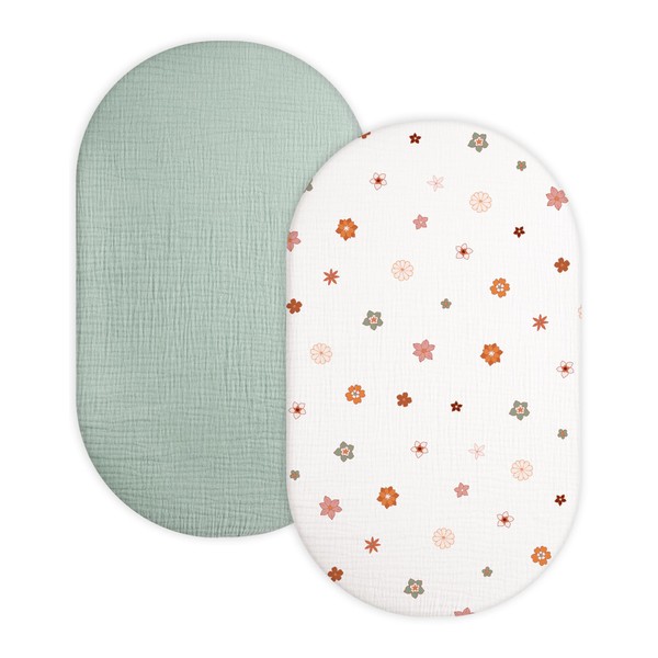 Bassinet Sheet for Baby Boy and Girl 2 Pack, Fitted Sheets for Rectangle, Oval, Hourglass Bassinet Mattress, Muslin Moses Basket Sheets with Neutral Style(Sage & Flower-B)