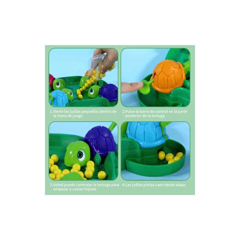 Funcionamiento: Vierte las judías dentro de la mesa de juego, pulsa la barra de control en la parte trasera de la tortuga para controlar que la tortuga empiece a comer las judías, las judías comidas caerán desde abajo.