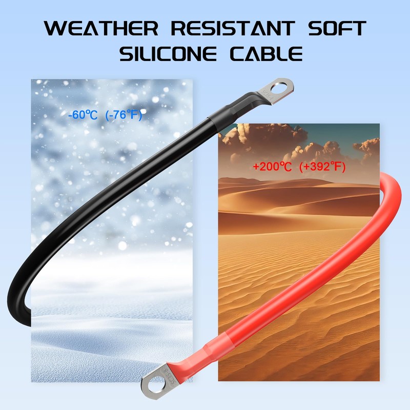 - 【Safe & Durable】Premium flexible silica gel insulated jacket of battery wires which resists abrasion, waterproof and moisture-proof, flame retardant and heat insulation, cable ends are sealed with heat shrink tubing for heat insulation.
