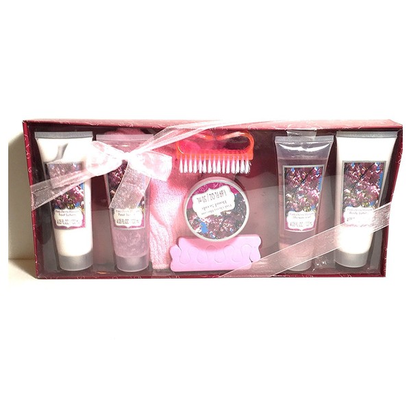 Pink Cherry Blossom Total Foot, hand and Body Bath and Shower Set includes: 4.05 fl oz foot lotion 4.05 fl oz foot scrub 1.69 fl oz hand scrub 4.05 fl oz shower gel 4.05 fl oz body lotion Scrub brush Scrubbing gloves Separators