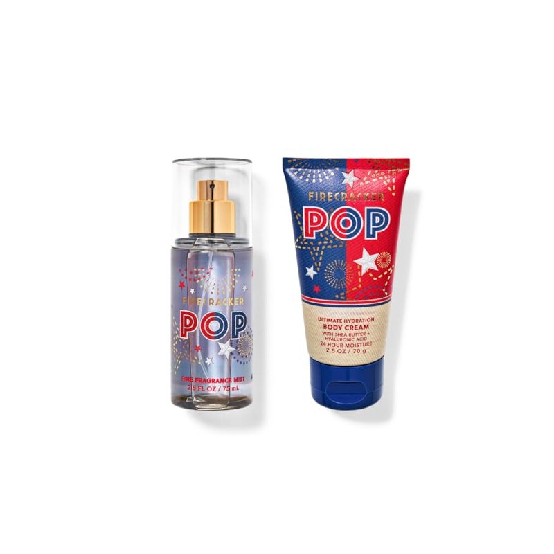 • Bath and Body Firecracker Pop set of two. 1 - Fine Fragrance Body Spray (2.5 fl oz / 75 mL) & 1 - Ultimate Hydration Body Cream (2.5 oz / 70 g)