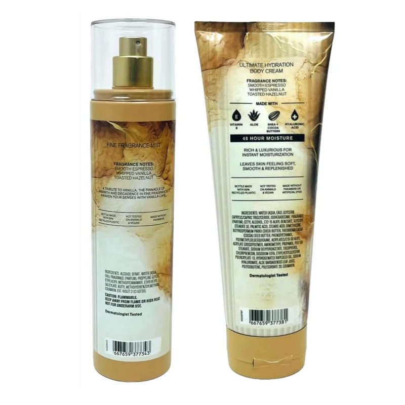 - INCLUDES: Vanilla Café set of two. 1 - Fine Fragrance Body Spray (8 fl. oz. / 236 mL) & 1 - Ultimate Hydration Body Cream (8 oz. / 226 g)