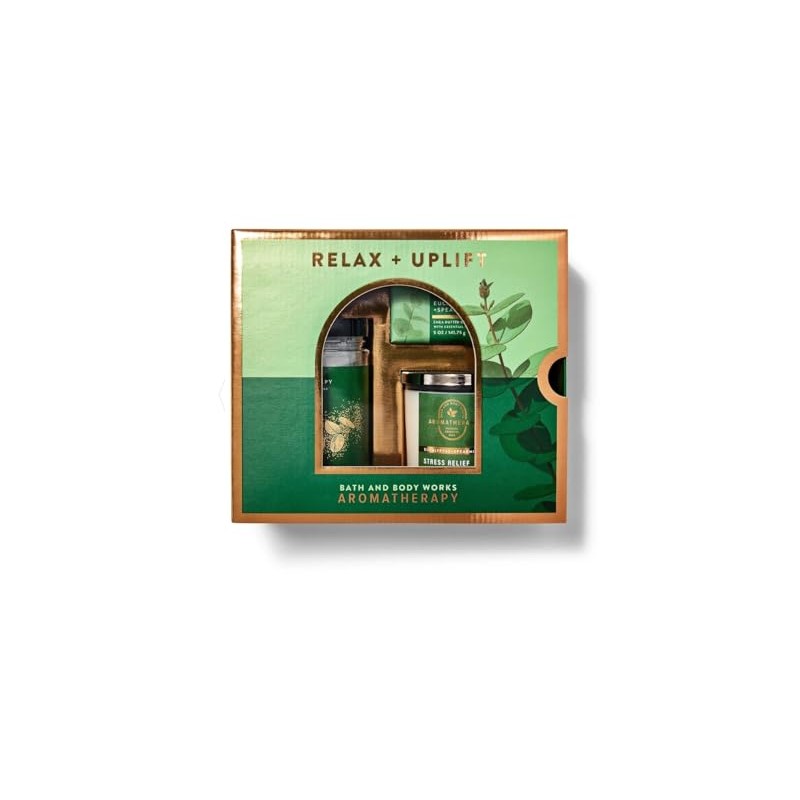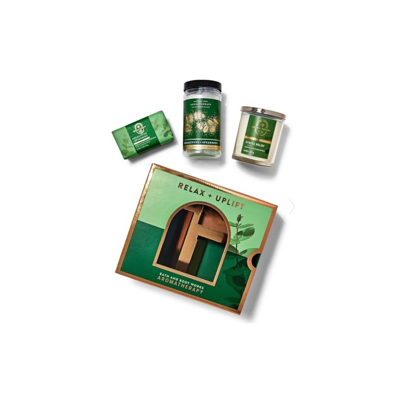 - GIFT SET CONTENTS: Complete aromatherapy set featuring Eucalyptus + Spearmint bar soap, stress relief candle, and aromatherapy body lotion in an elegant green and gold gift box