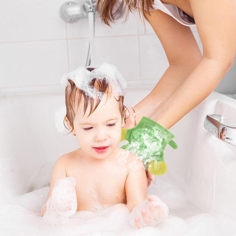 - ♚Suitable Size: The baby bath mitt is approx. 8.6 x 5.5 inch, big enough to help the kids to take a shower. It fits most adults' palms and allows kids to try to use it. The mitt will stay on hands firmly and do not fall off easily.