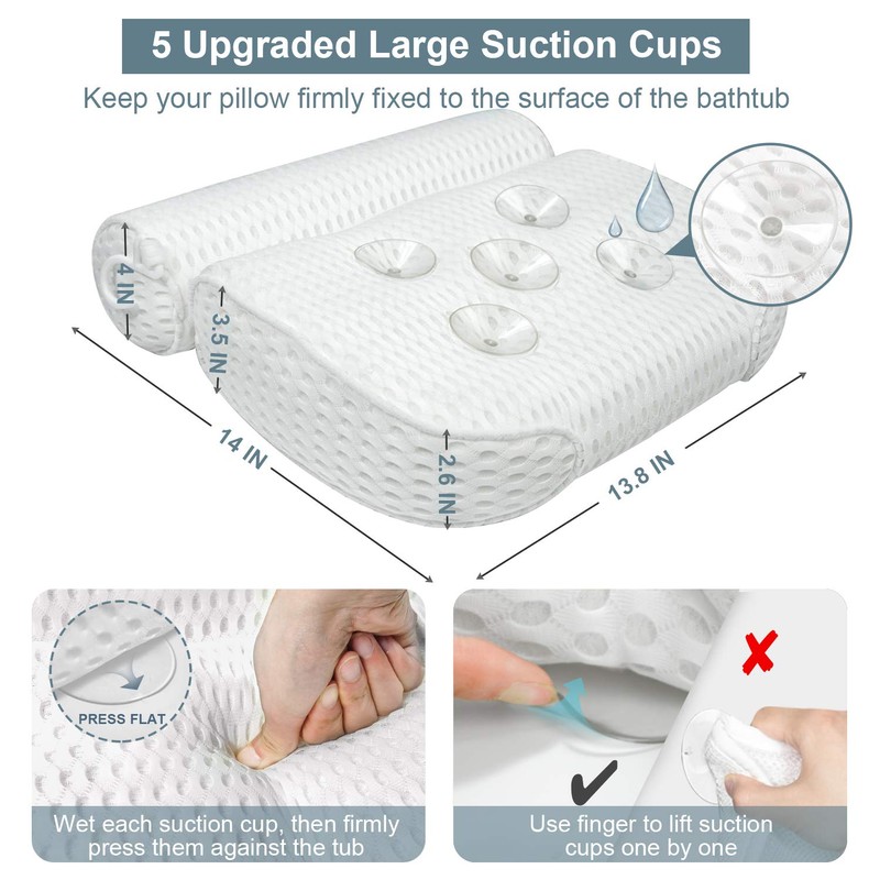 - 🛀Upgraded Air Mesh Material: Our bath pillow Made by unique 4D air mesh technology. Much softer, comfortable, and breathable compared to 3D air mesh bathtub pillow. The filler of multi-layer mesh polyester fibers allows air and moisture to flow through and dry quickly. Smooth and comfortable to use, will not stimulate your skin like other cheap materials, offering you a soft and comfortable experience