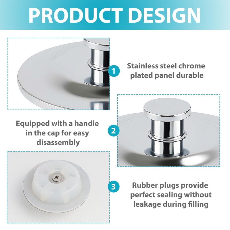 • HIGH QUALITY SURFACE FINISH The surface of the plug is high quality chrome plated, giving it an attractive mirror effect. The accompanying white silicone seal is not only resistant to aging, but also easier to handle than conventional plastic or rubber plugs.